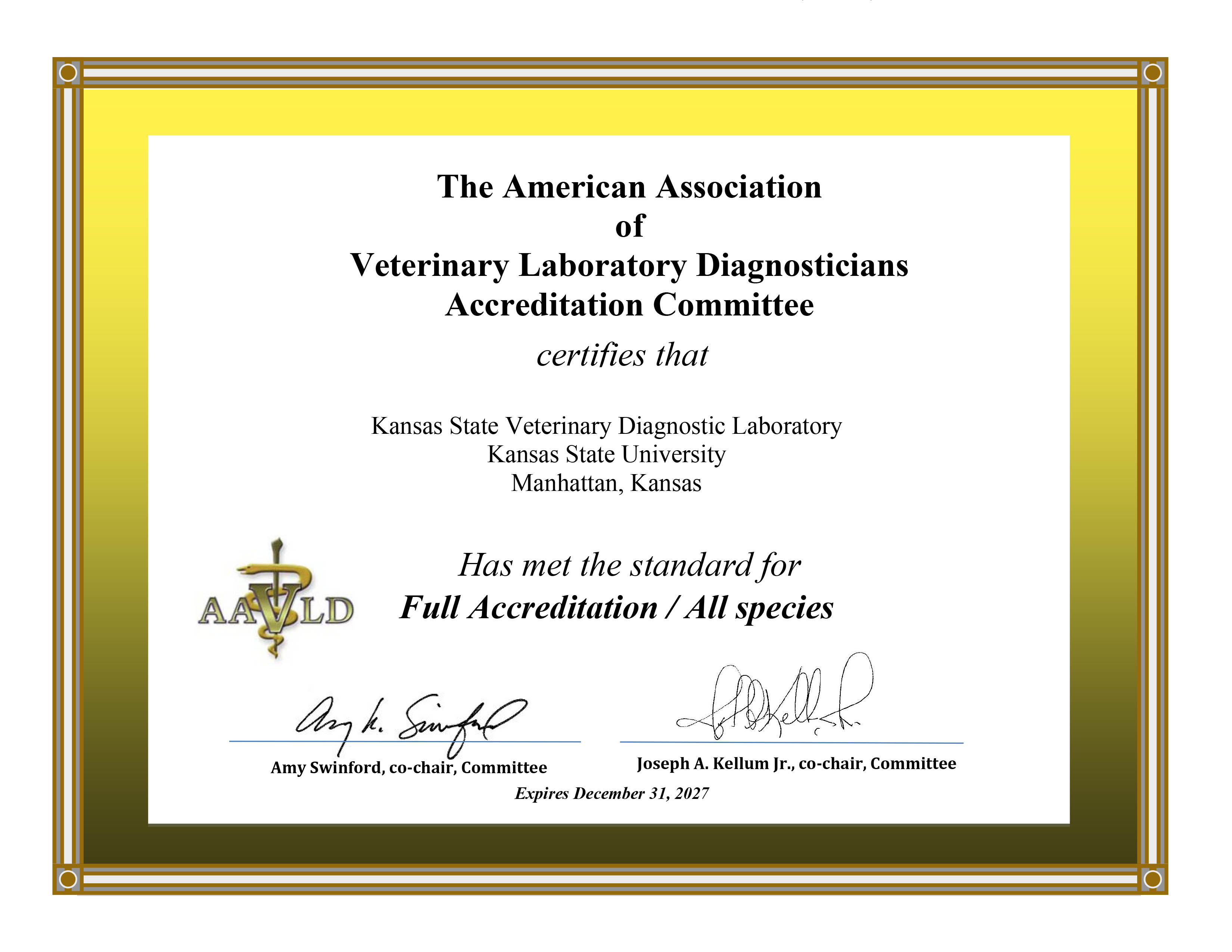 The KVDL is accredited through the American Association of Veterinary Laboratory Diagnosticians (AAVLD). The Quality Management Program is overseen by the Director of Quality who reports to the KVDL Director. Full accreditation status and maintaining a good quality system reassures our clients of how important the quality of their results are. It also allows our laboratory to focus on continuously improving testing techniques and processes.